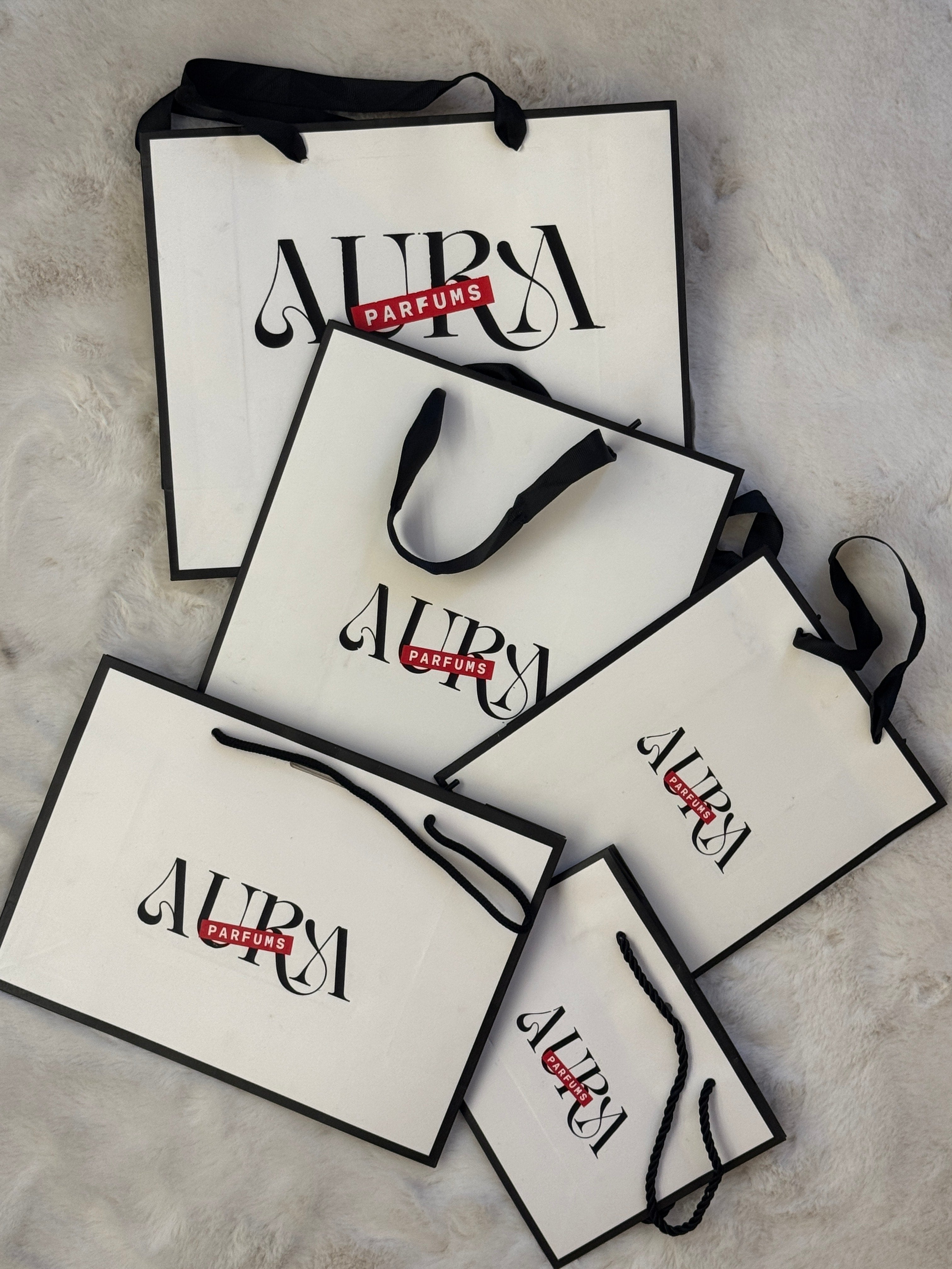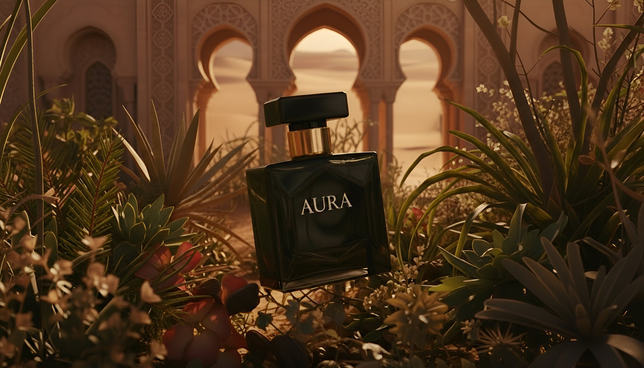 AURA PARFUMS se presenta como una marca de perfumería árabe contemporánea, donde el misterio del Oriente se mezcla con la elegancia urbana actual. Su estética combina el blanco clásico del lujo con un rojo intenso y pasional que sugiere poder, deseo y carácter. La tipografía de AURA, con curvas refinadas y trazos que recuerdan a la caligrafía árabe, insinúa tradición, herencia y sofisticación ancestral.